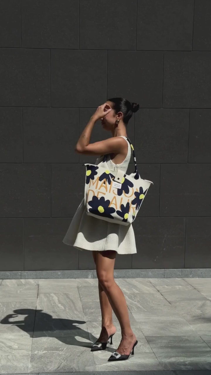 Maison de Auri’s Poche Grande Happy combines functional design with a bold floral knit print that brings a cheerful edge to its clean silhouette. Spacious and structured, it’s designed to carry more while keeping the look light and chic.